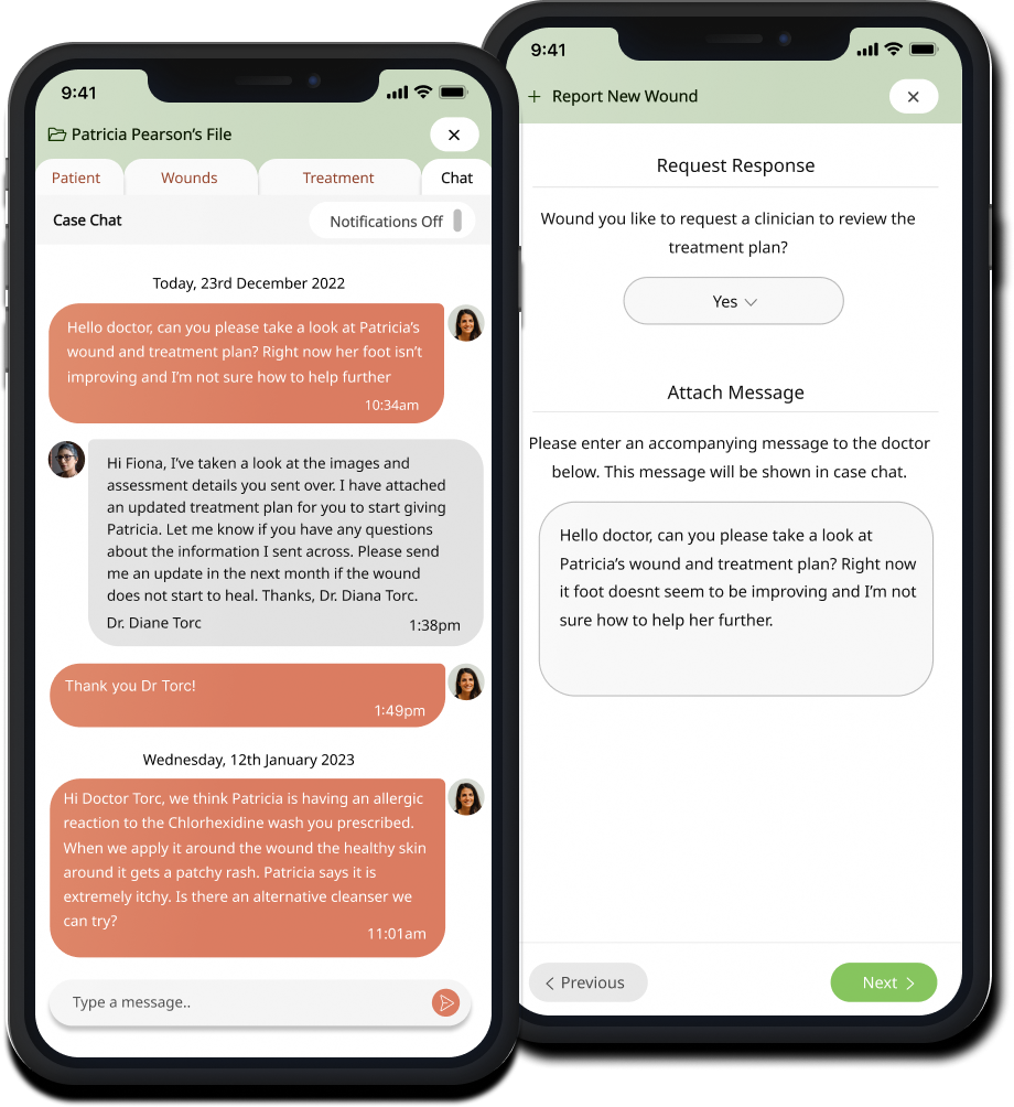 Clinicians are able to respond directly within a patient's case file when a front-line carer requests assistance through the mobile app. From here, clinicians can complete a standard response form to diagnose the wound and prescribe appropriate treatment. Additionally, there is a direct communication channel that allows messaging between clinicians and front-line carers, enabling them to ask questions and collaborate when providing medical care to the patient.