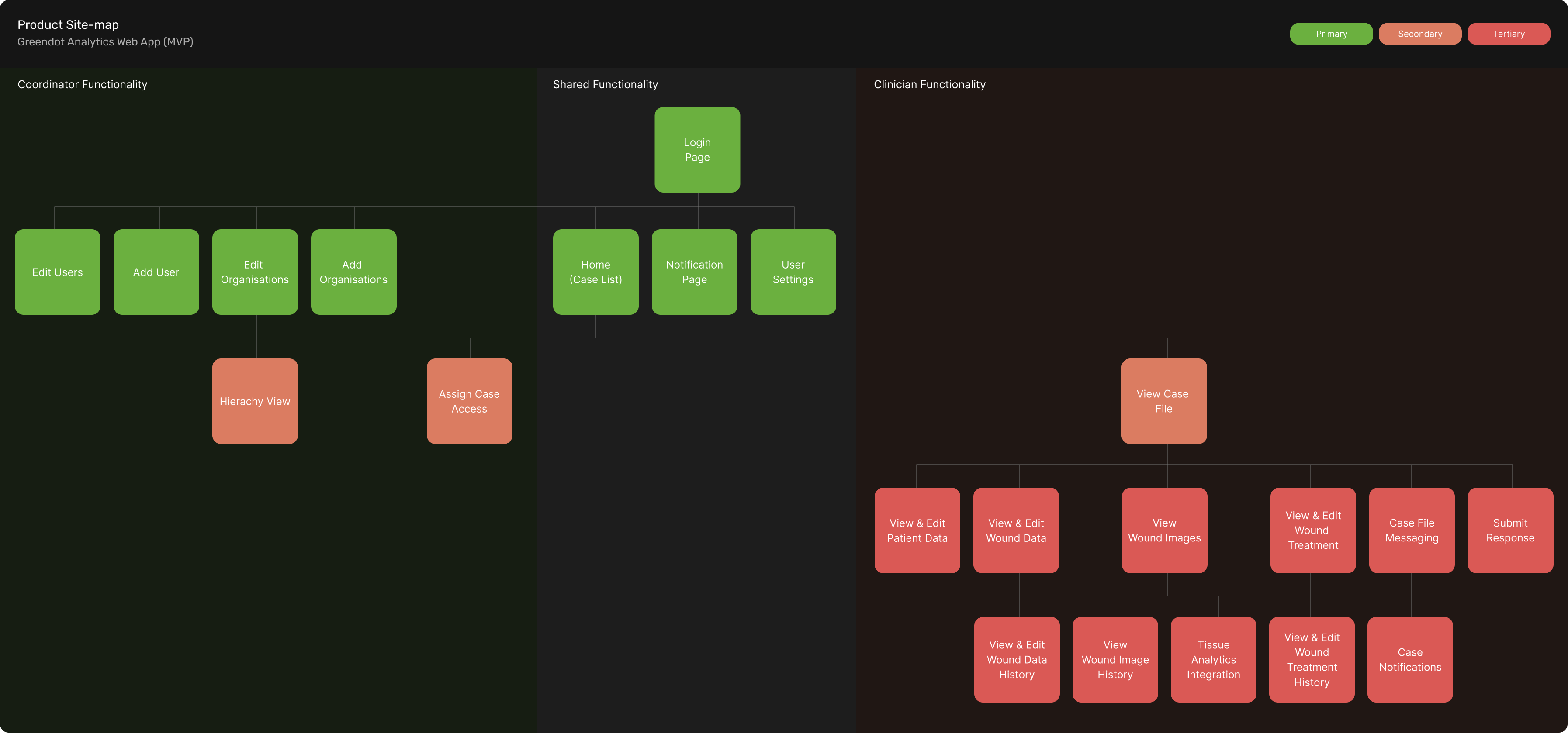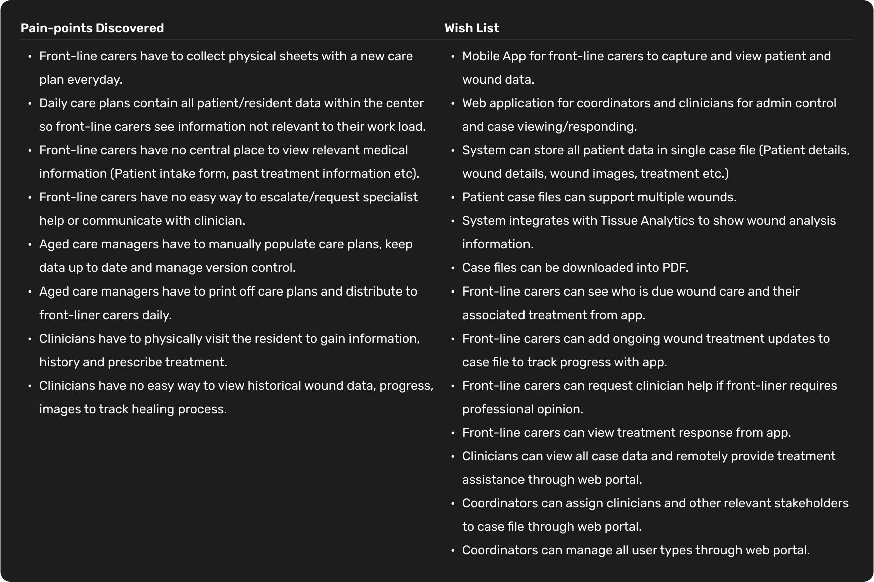 Initially I was presented with a functional requirements document that the product manager had put together. The Product manager had already conducted interviews and derived insights from wound specialists and aged care managers. From the data presented I was able to determine the following for the MVP of the product: