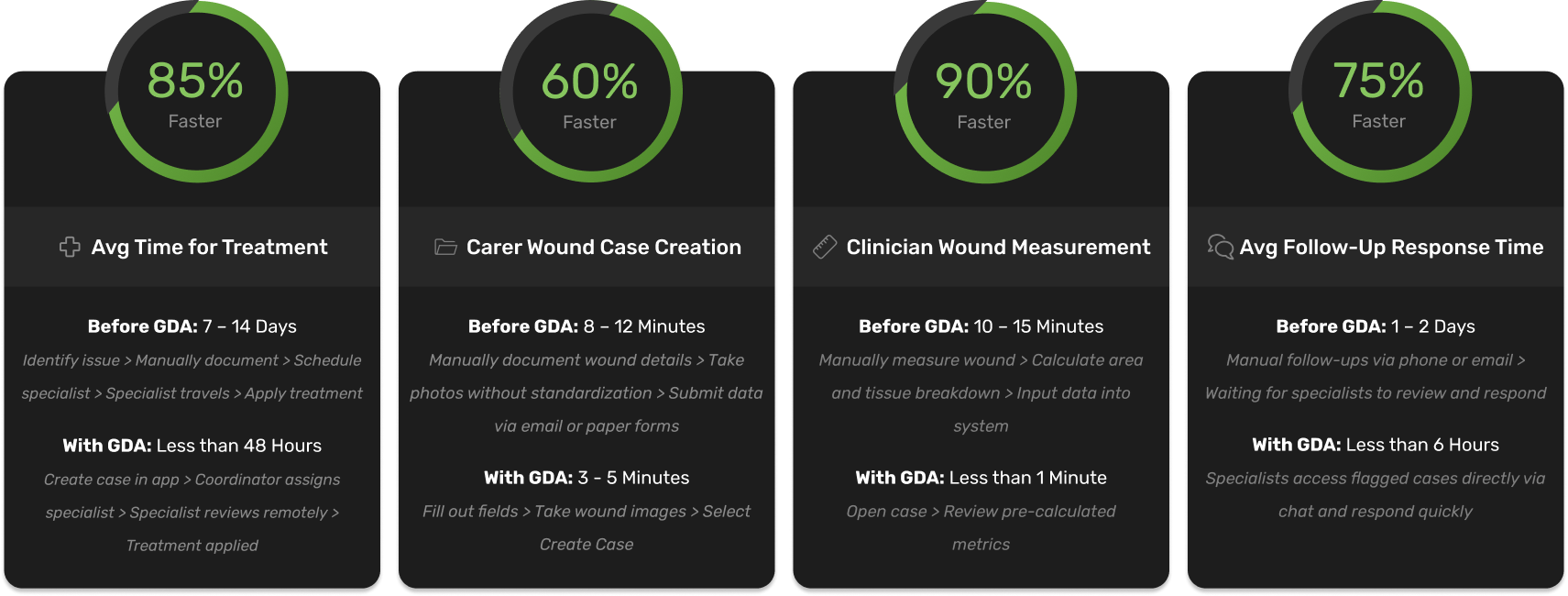 Greendot Analytics transformed wound care management, cutting treatment times from 7-14 days to under 48 hours - an 85% improvement. The streamlined workflows allowed carers to create cases 60% faster, clinicians to measure wounds 90% quicker, and specialists to respond 75% faster. These advancements showcased GDA's ability to set a new standard for efficiency and care in aged care facilities, though its journey was ultimately impacted by unforeseen challenges.