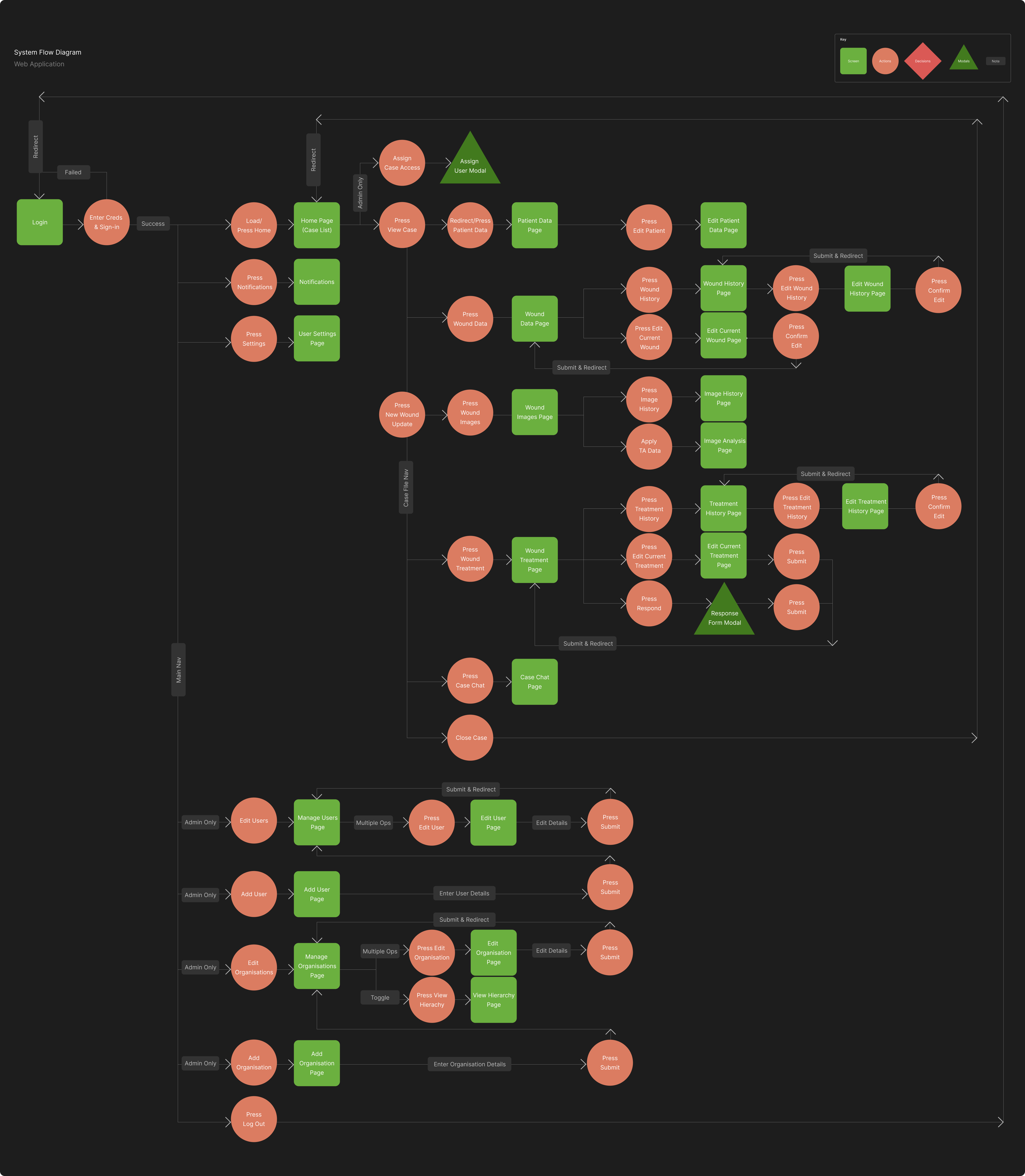System WireflowsThis part of the design process was by far the most iterative and challenging. The collaboration sessions the Product Manager held with various stakeholders revealed conflicting priorities based on different user roles. While the web application workflow required only a few iterations, the mobile app flows - such as creating a case, updating a case, and handling deviations like requesting a response - underwent more than ten iterations. Ultimately, a flow was agreed upon after the PM presented a range of options to each stakeholder. Even so, it was acknowledged that further research and usability testing would likely be needed during the aged care center trials. The development team was advised to plan for future tweaks to the flows once the MVP version of the app was released.