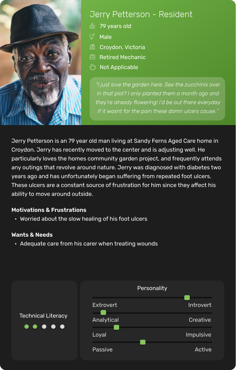 As the MVP of the software neared completion and the team prepared for trials in aged care facilities, the pandemic struck. In Melbourne strict lockdowns were enforced for most of the year, effectively closing aged care centers to the public, including our team. Since Greendot Analytics relied on in-person data collection through the app, the solution couldn't be rolled out and, unfortunately, was discontinued before it could even launch.
