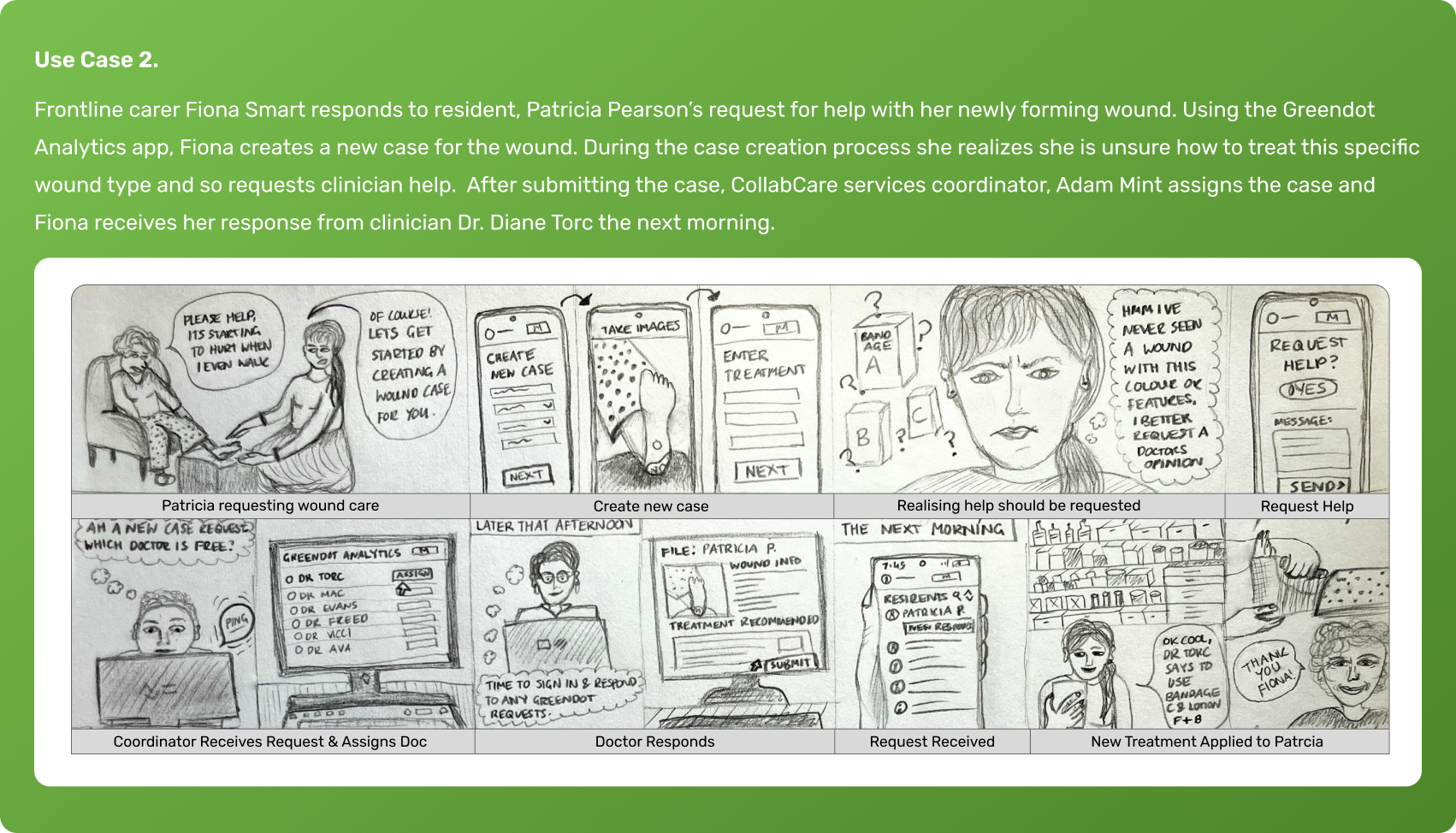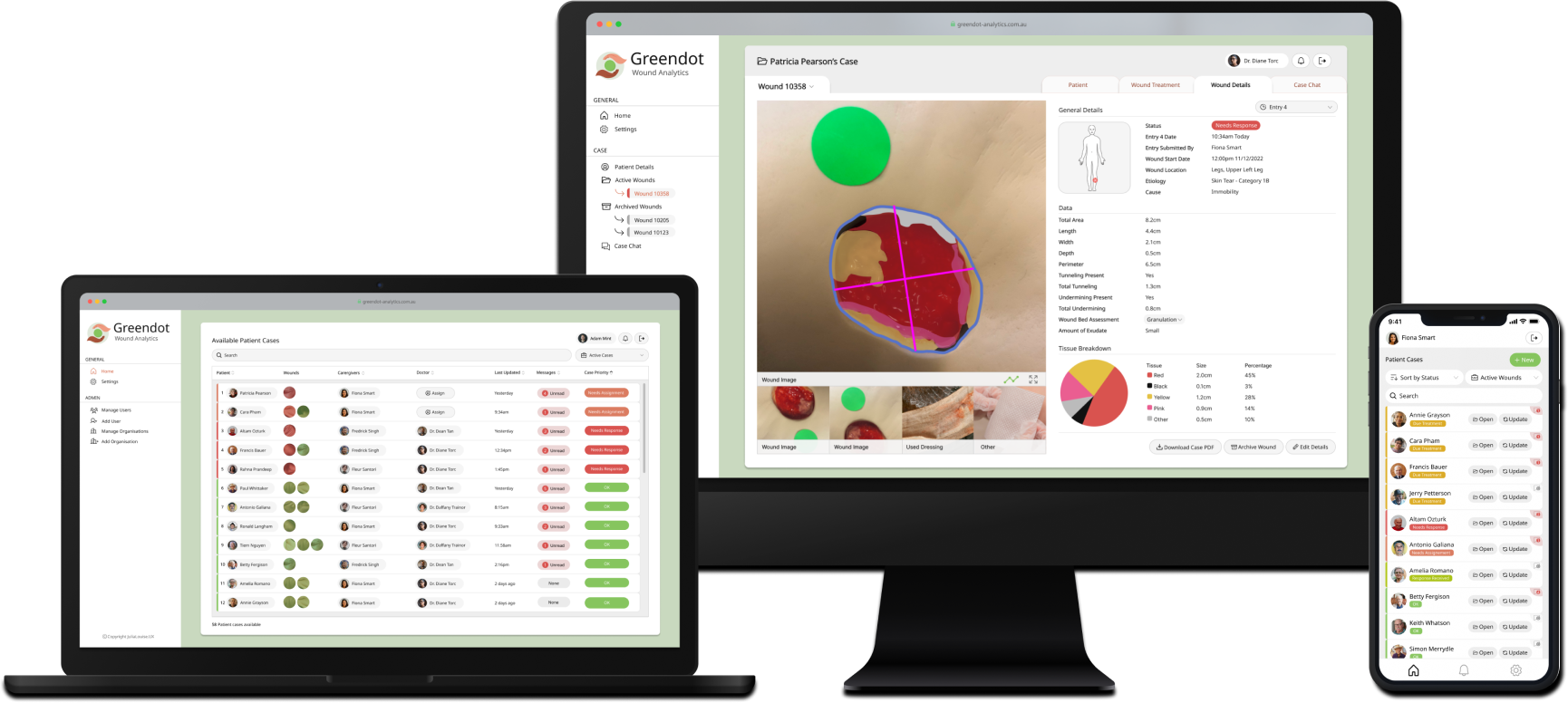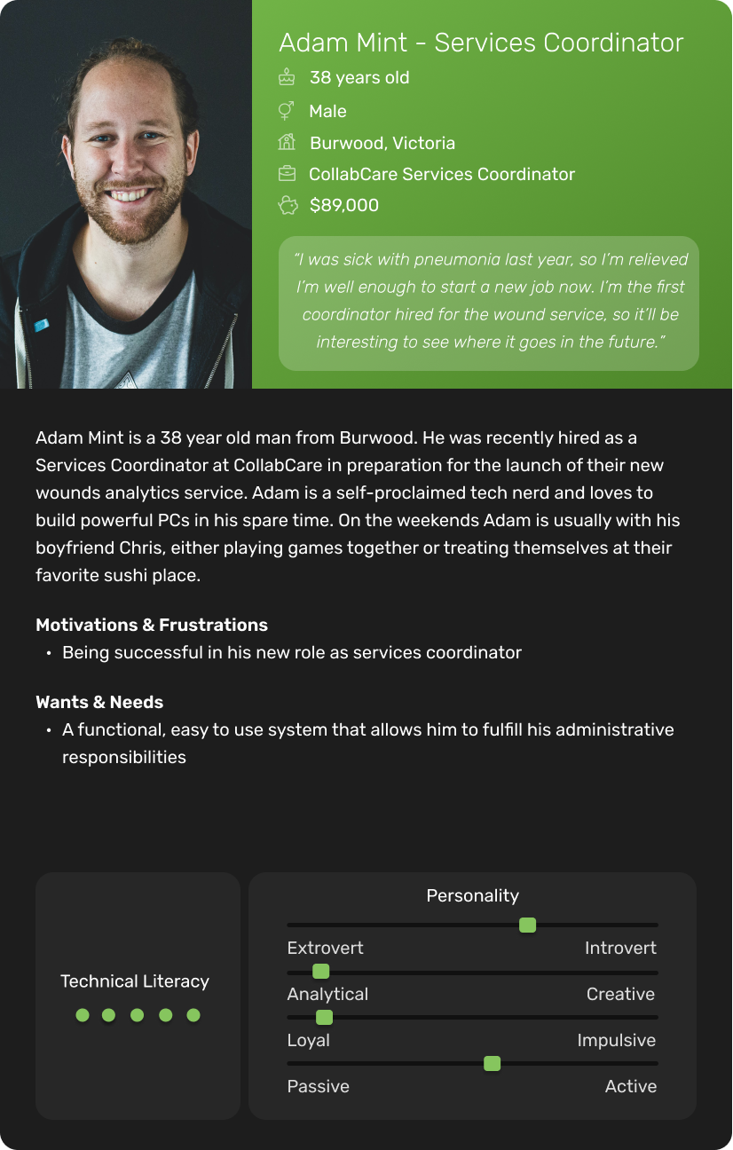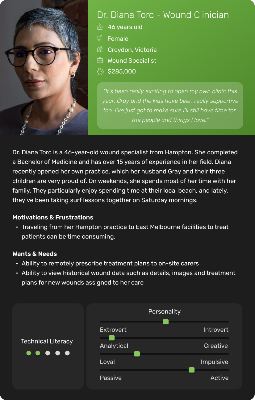 CollabCare, a Melbourne-based technology company specializing in digital health services, identified a market gap for a digital wound management solution through their previous work with aged care facilities. They called this application Greendot Analytics and envisioned a system to track, analyze, and request specialist help throughout the wound healing journey. As the product designer at the company, I was tasked with designing the solution.