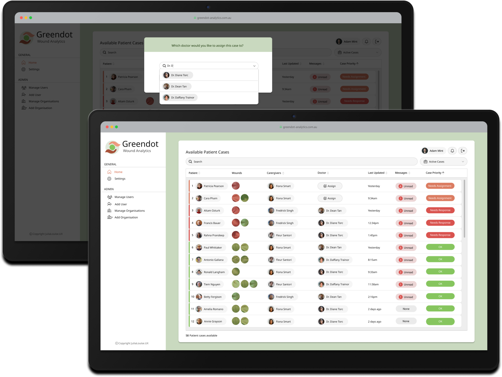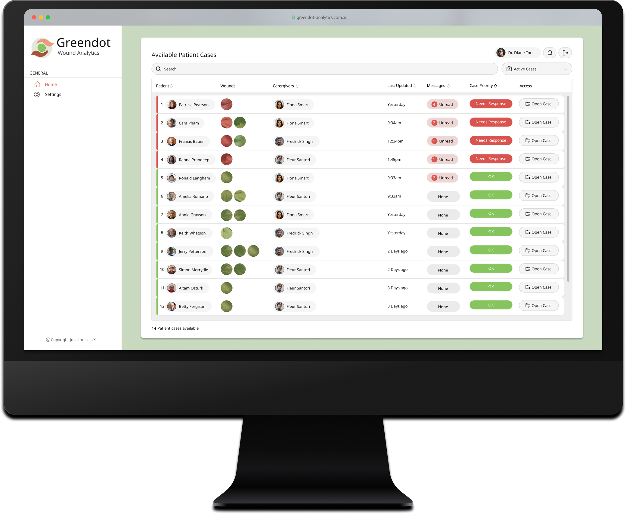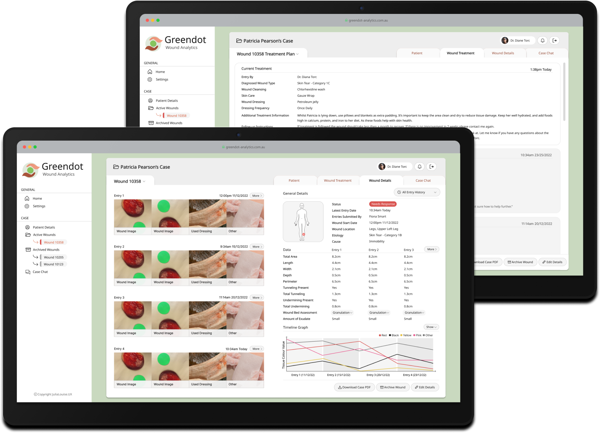 CollabCare, a Melbourne-based technology company specializing in digital health services, identified a market gap for a digital wound management solution through their previous work with aged care facilities. They called this application Greendot Analytics and envisioned a system to track, analyze, and request specialist help throughout the wound healing journey. As the product designer at the company, I was tasked with designing the solution.