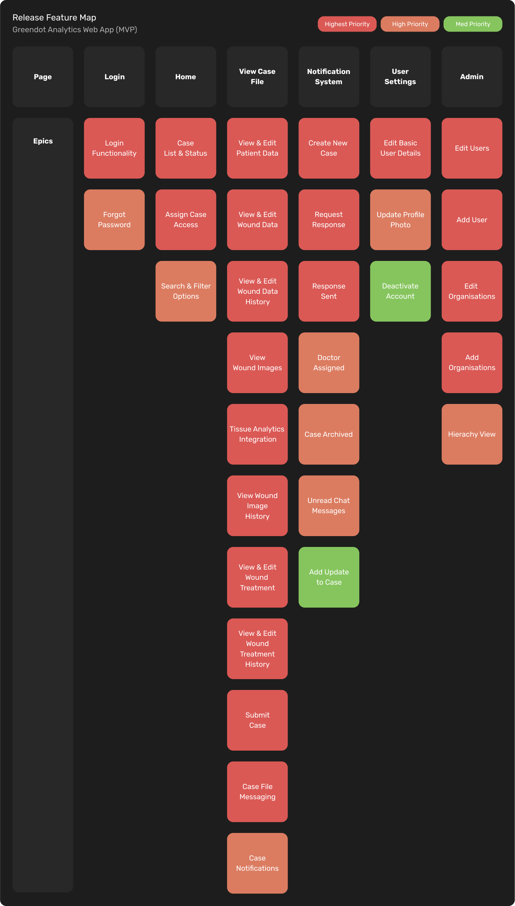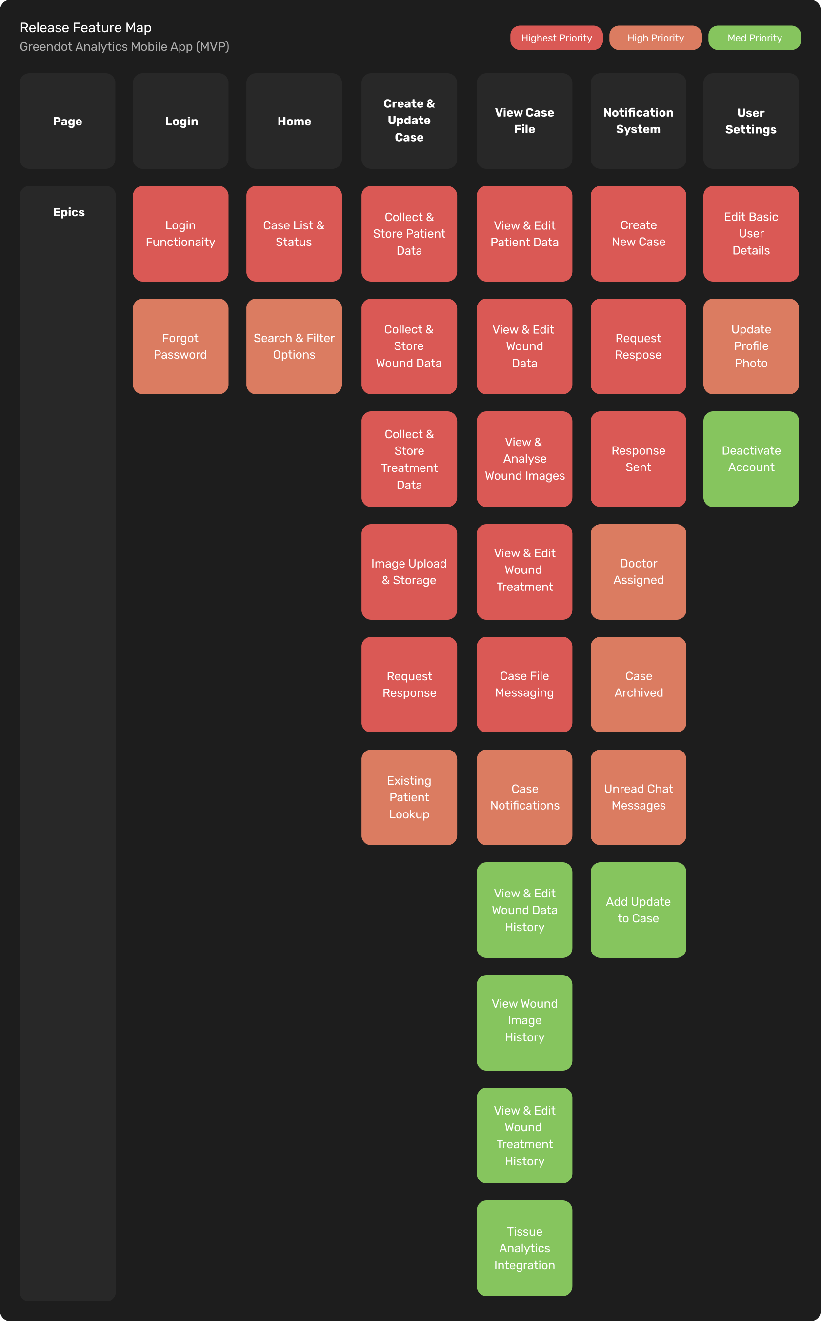 The first step in this phase of the project involved creating two release maps to prioritize the feature sets for the solution. Collaborating with the Product Manager, we created one release map for the mobile app, designed primarily as a wound-data capture system for front-line aged care workers. The second release map focused on the accompanying web application, which was intended to serve as a platform for coordinators to manage cases, users, and organizations, as well as for clinicians to oversee and provide wound care in aged care facilities.