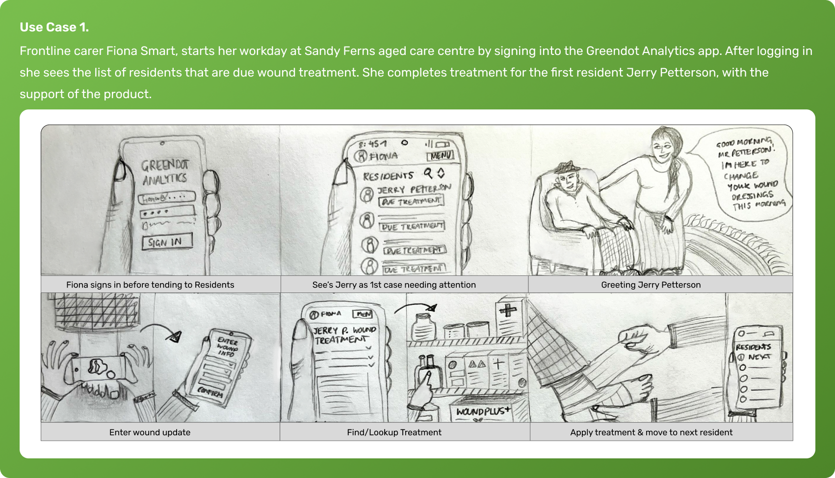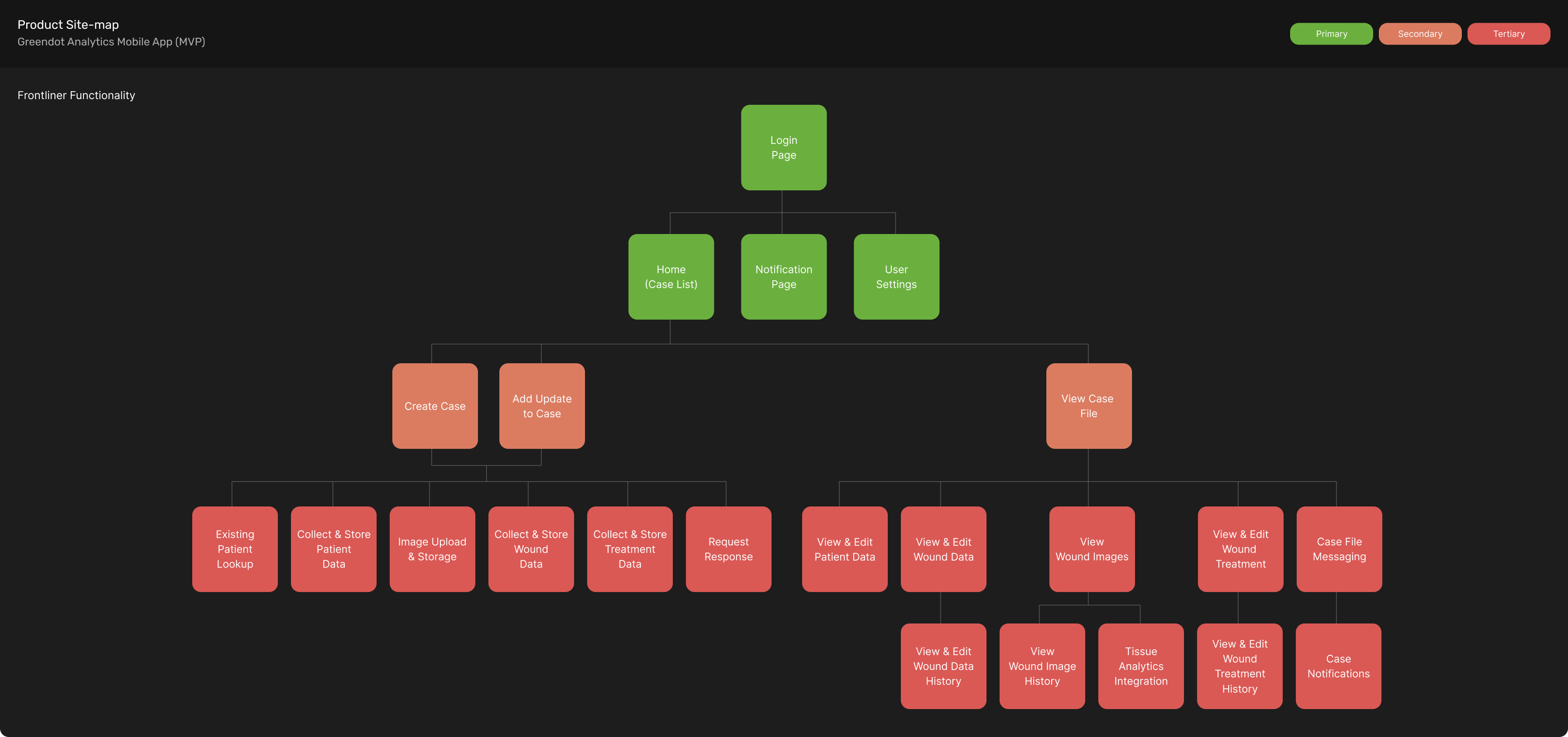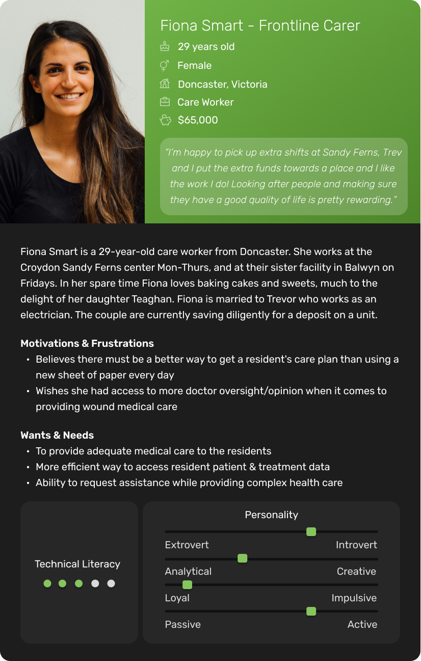 Initially I was presented with a functional requirements document that the product manager had put together. The Product manager had already conducted interviews and derived insights from wound specialists and aged care managers. From the data presented I was able to determine the following for the MVP of the product: