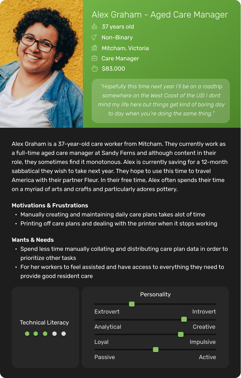 As the MVP of the software neared completion and the team prepared for trials in aged care facilities, the pandemic struck. In Melbourne strict lockdowns were enforced for most of the year, effectively closing aged care centers to the public, including our team. Since Greendot Analytics relied on in-person data collection through the app, the solution couldn't be rolled out and, unfortunately, was discontinued before it could even launch.